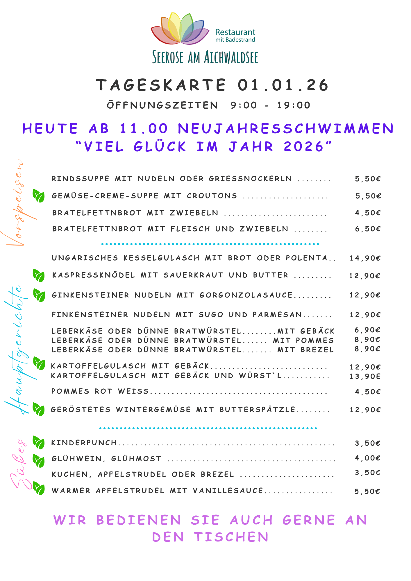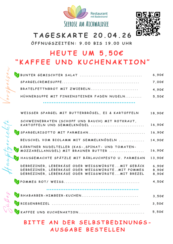 Im Restaurant Seerose am Aichwaldsee erwartet Sie täglich eine wechselnde Tageskarte mit frisch zubereiteten Speisen aus regionalen Produkten der Alpen-Adria-Region.
